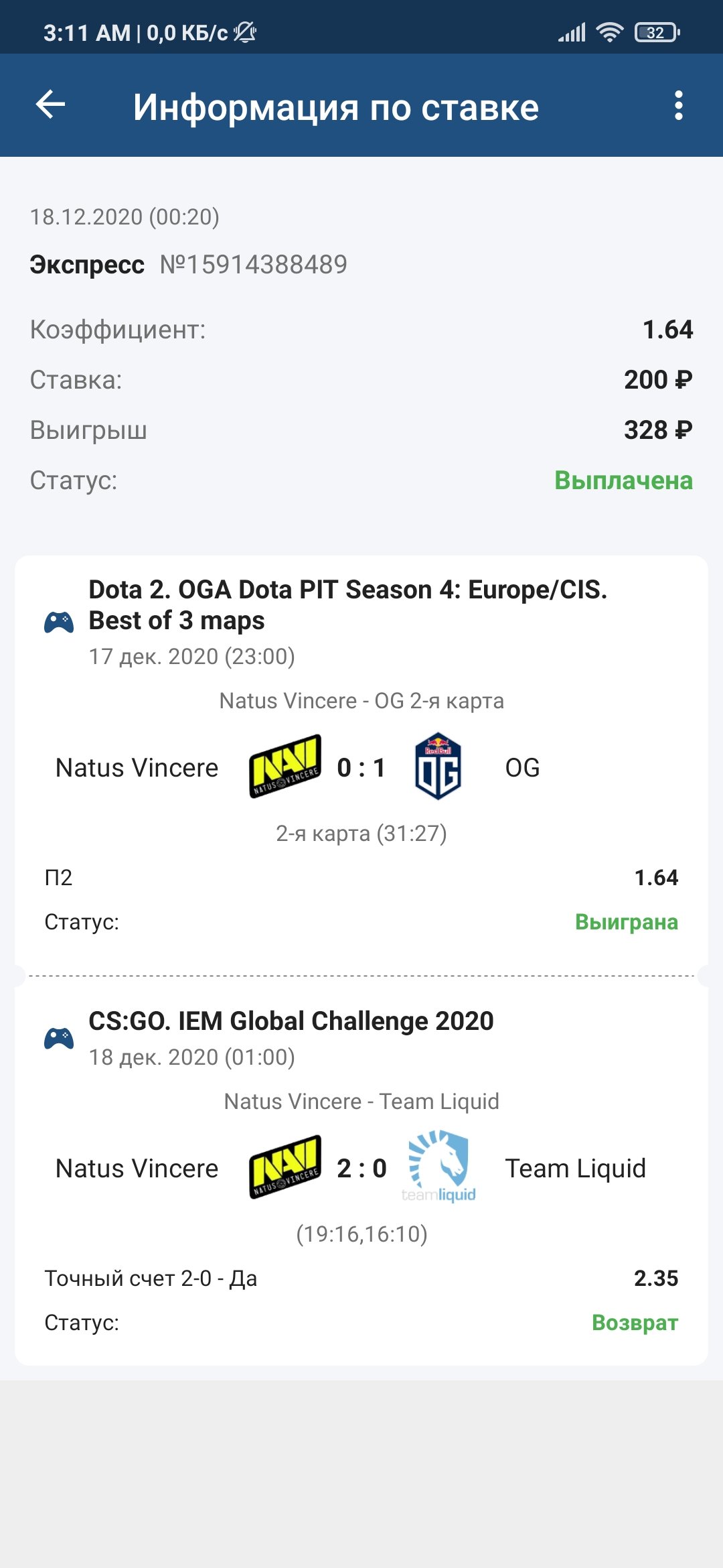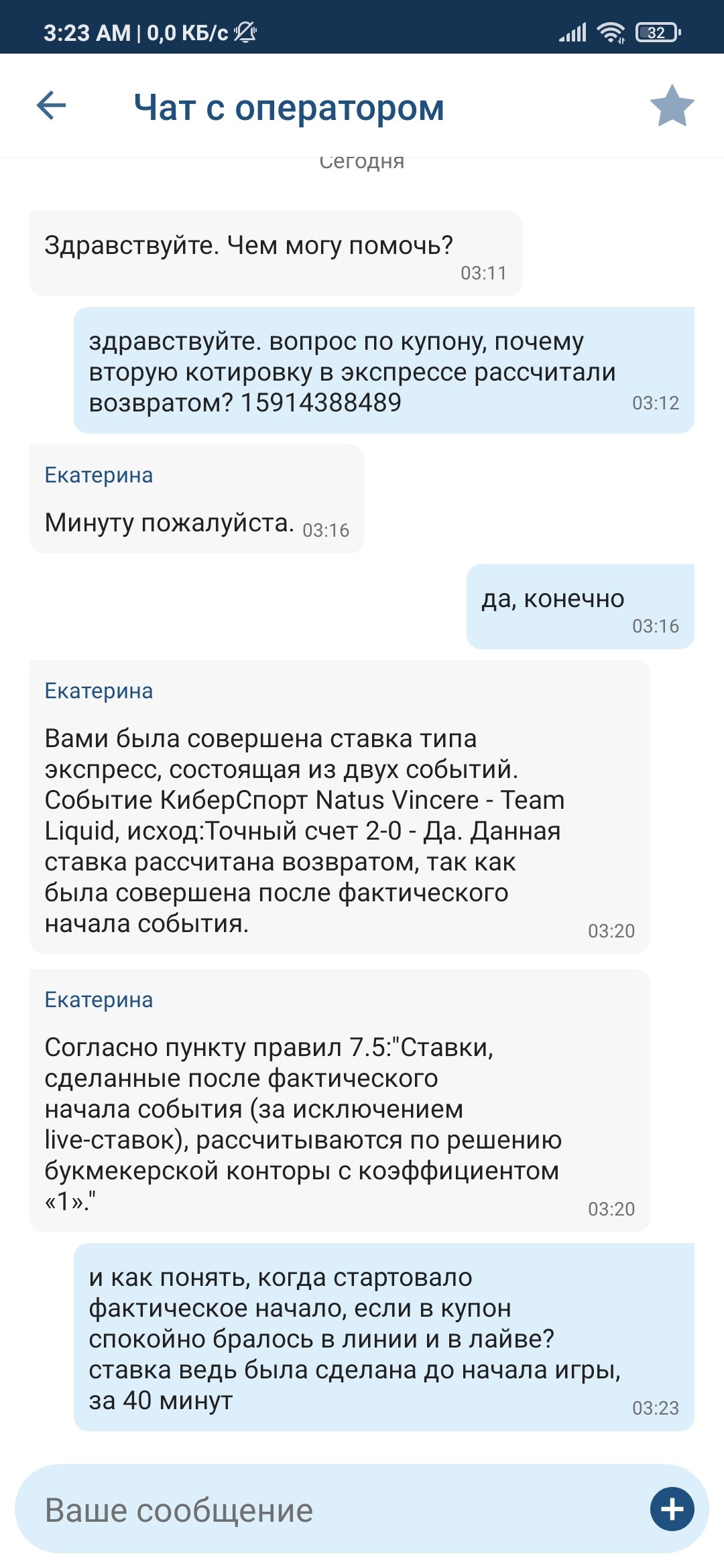 Приветствую. Слепил я, значится, экспресс с общим коэффициентом 3,854. Но почему-то одну из котировок букмекер рассчитал возвратом. Пообщался с поддержкой. Они говорят, что ставка была сделана после фактического начала события. Хотя до матча было 40 минут, брал я коэффициент 2,35 из линии. По скриншоту видно время ставки и время начала игры.