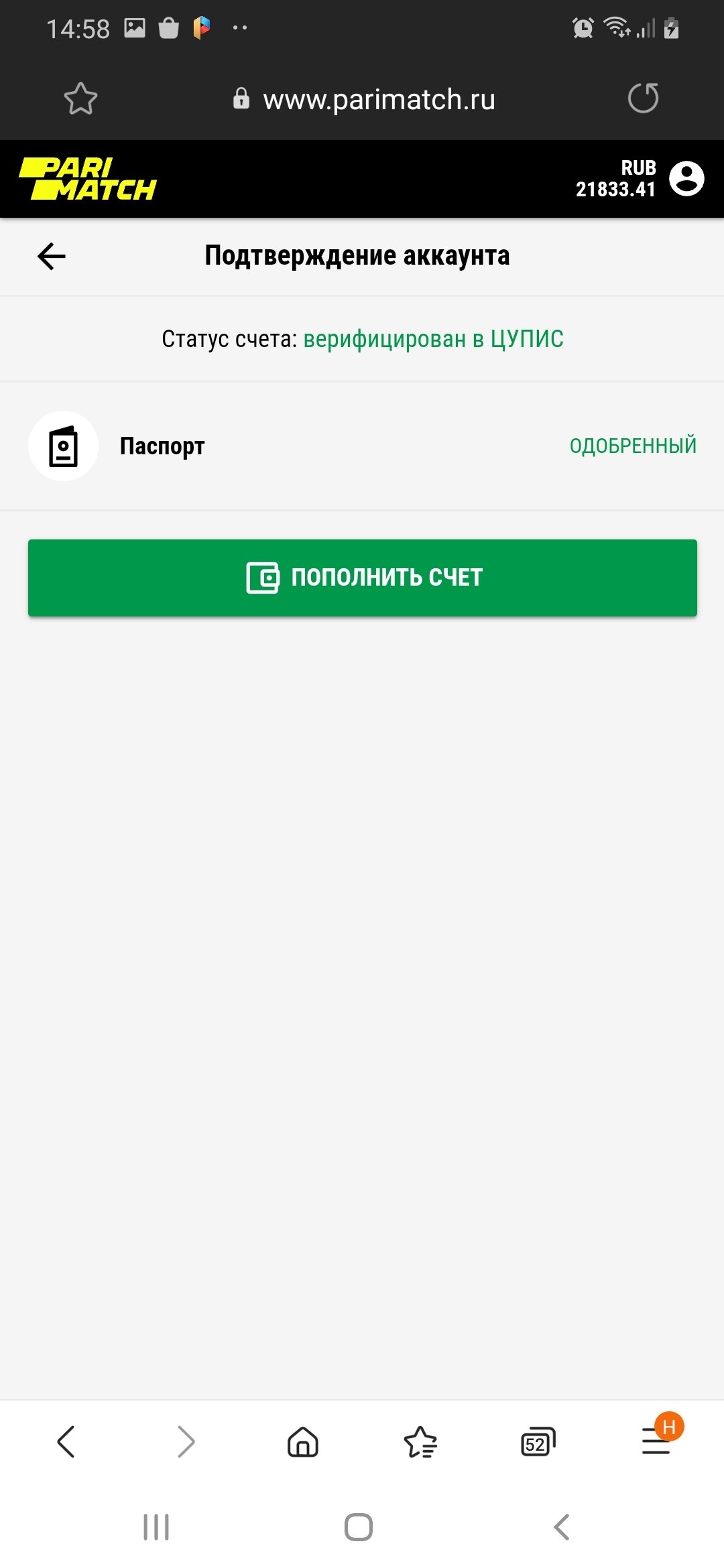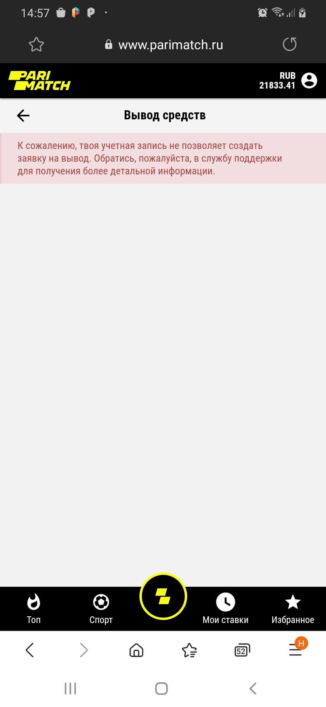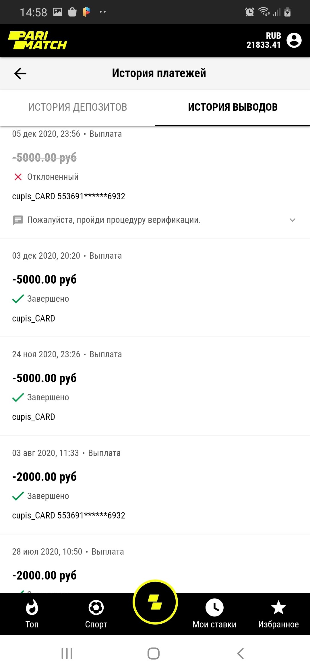 До этого дня они платили все вовремя, заказывал сумму и в течение дня высылали на карточку заказал на вывод 5000р. На следующий день смотрю деньги вернулись на общий счет . А на выводе средств написано пройдите повторную верификацию. Написал в париматч,- затребовали фото паспорта страницы, и фото паспорта мое и на листке надпись. Отправил им. Через неделю ответили, пришлите еще фото мое с открытой пропиской и платежку за ЖКУ. Выслал. Ответили через 1-2 часа( плохо сфотографирована платежка за ЖКУ) перефотографировал, выслал им. Через неделю, сейчас, уже надо прислать фото с перепиской. Этот дурдом, я так понял, и будет продолжаться дальше, через неделю они так и будут подкидывать новые задания. Прошу вас помочь мне вывести мои деньги.
