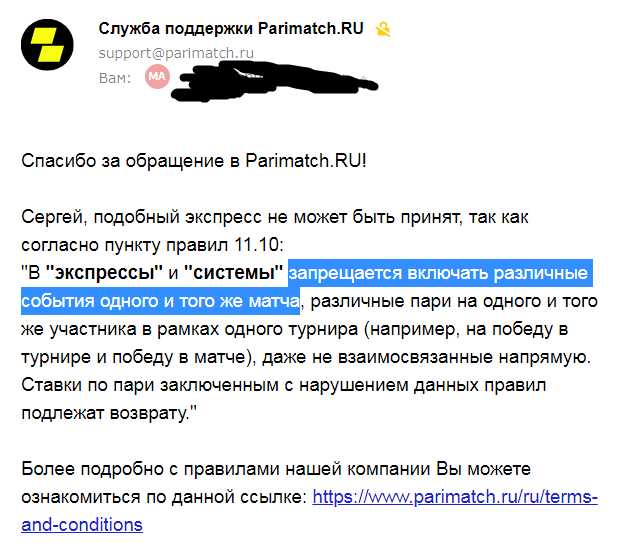 Приняли экспресс где поставлена статистика одного и того же матча , силовые приемы и броски в одном матче. Написал им в поддержку говорят по правилам нельзя такое ставить,тоесть если даже и сыграло мнеб не выплатили, требую возврата суммы,ХЭЛП, Прилагаю скрин где нельзя такое ставить и скрин ставки