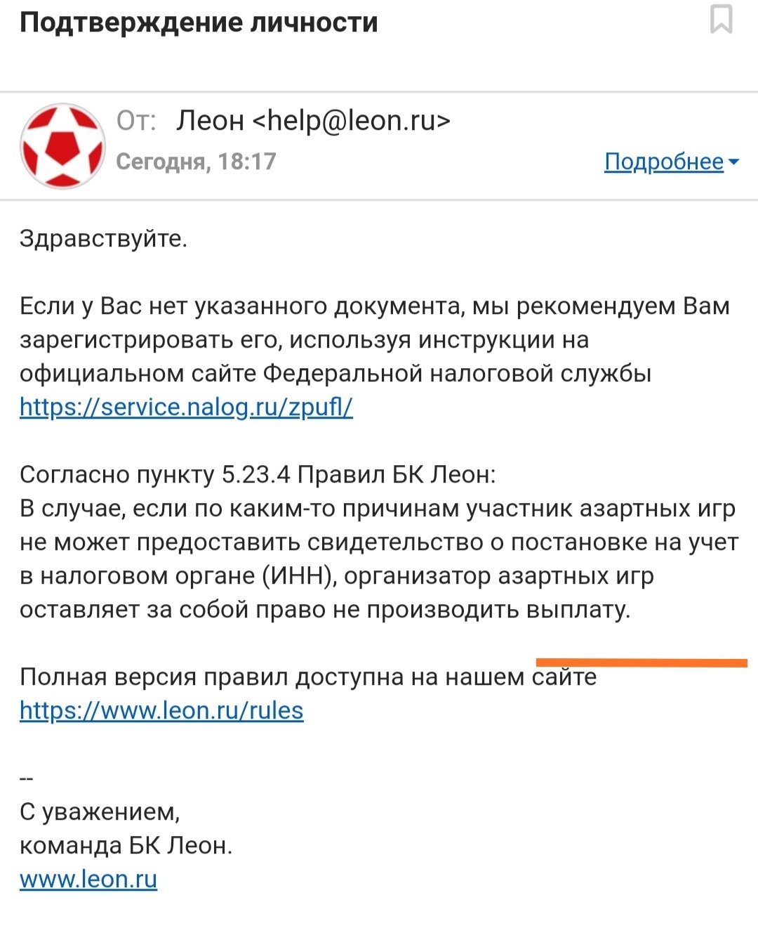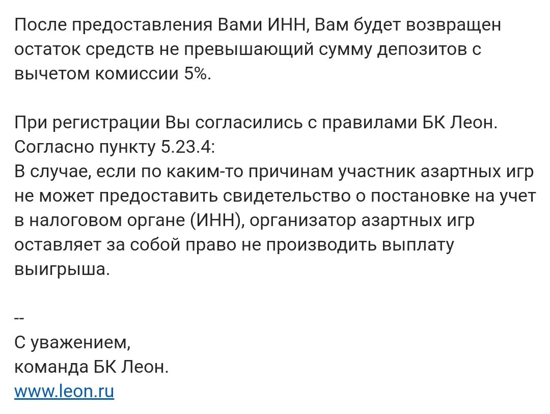 Букмекер пишет мне что не может сделать выплату без ИНН, это ложь! Многим игрокам делается выплата без предоставления документов. Как же остальным игрокам вернули деньги, которые оформляли у вас на сайте жалобы а мне отказывают, знаете я начинаю понимать с какой целью вы создали этот ресурс и проще будет написать заявление в полицию там законы хотя бы знают в отличие от вас.