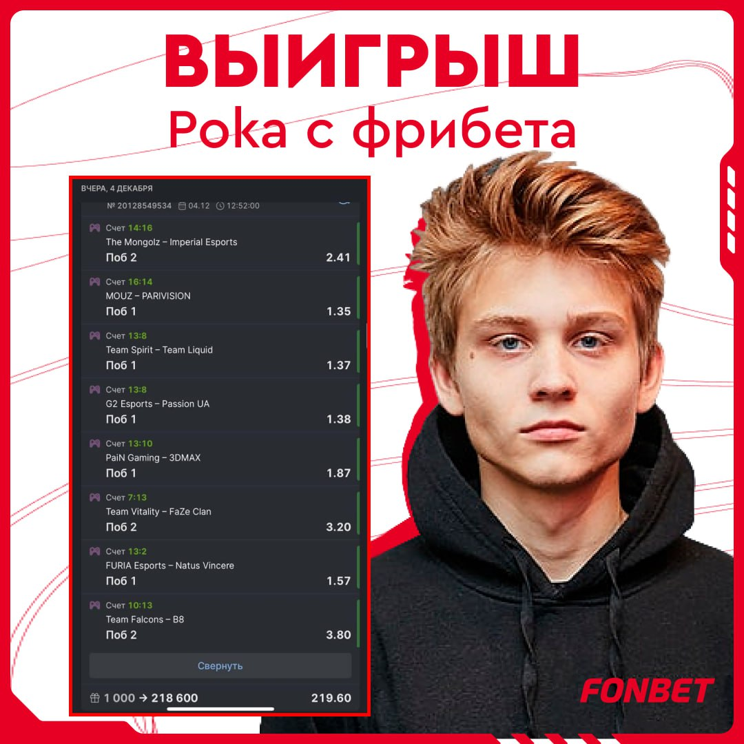 Точнее не кто-то, а амбассадор Fonbet Esports и стример Poka, который собрал экспресс с кэфом 219.60 на матчи первого раунда третьей стадии мейджора, зарядил на него фрибет и выиграл. Мощнейшим паровозом поделился сам букмекер: