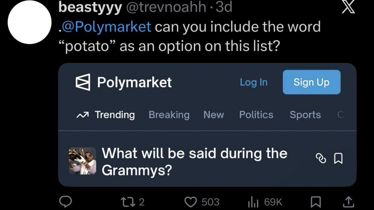 А дело вот в чём. Буквально за три дня до церемонии пользователь с ником trevnoahh тэгнул в соцсетях официальный аккаунт Polymarket с просьбой добавить слово «картошка» (potato) в линию, которая прямо так и называется — «Что будет сказано во время церемонии вручения премии ''Грэмми''?»