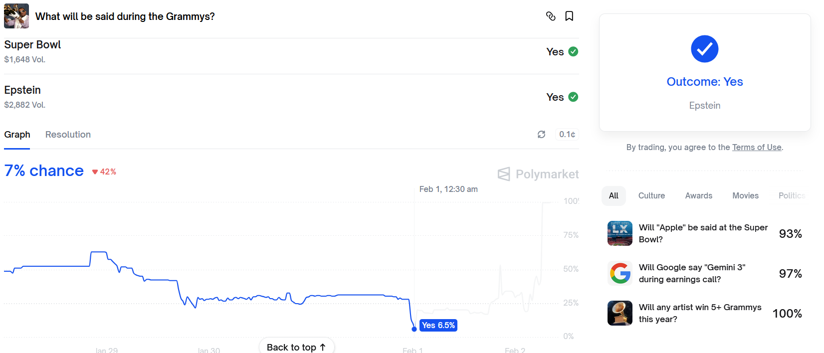«Добро пожаловать на «Грэмми». Картошка. Если вы поставили на Polymarket на то, что я скажу это слово, вы выиграли кучу денег. Поздравляем!»