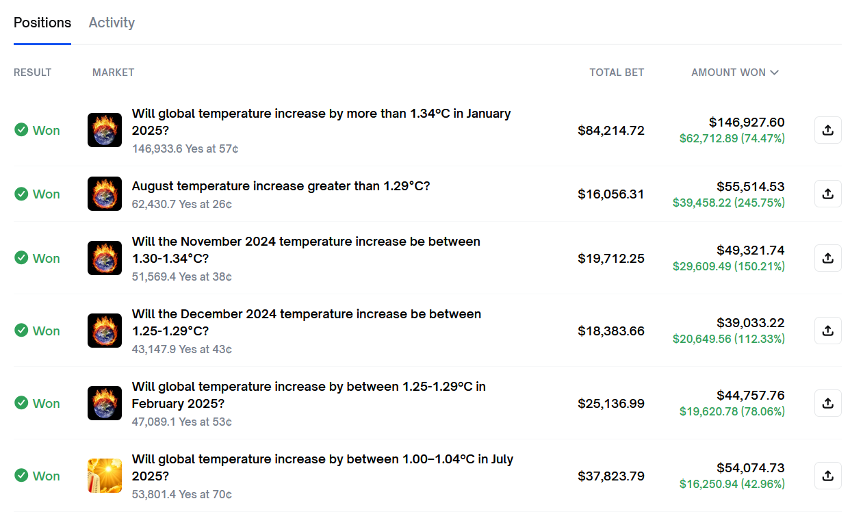 Причём если внимательнее изучить его профиль, окажется, что солидную часть банка сделали ставки на глобальное потепление — винстрик на рынке повышения температуры на планете в целом дошёл до 38 позиций.