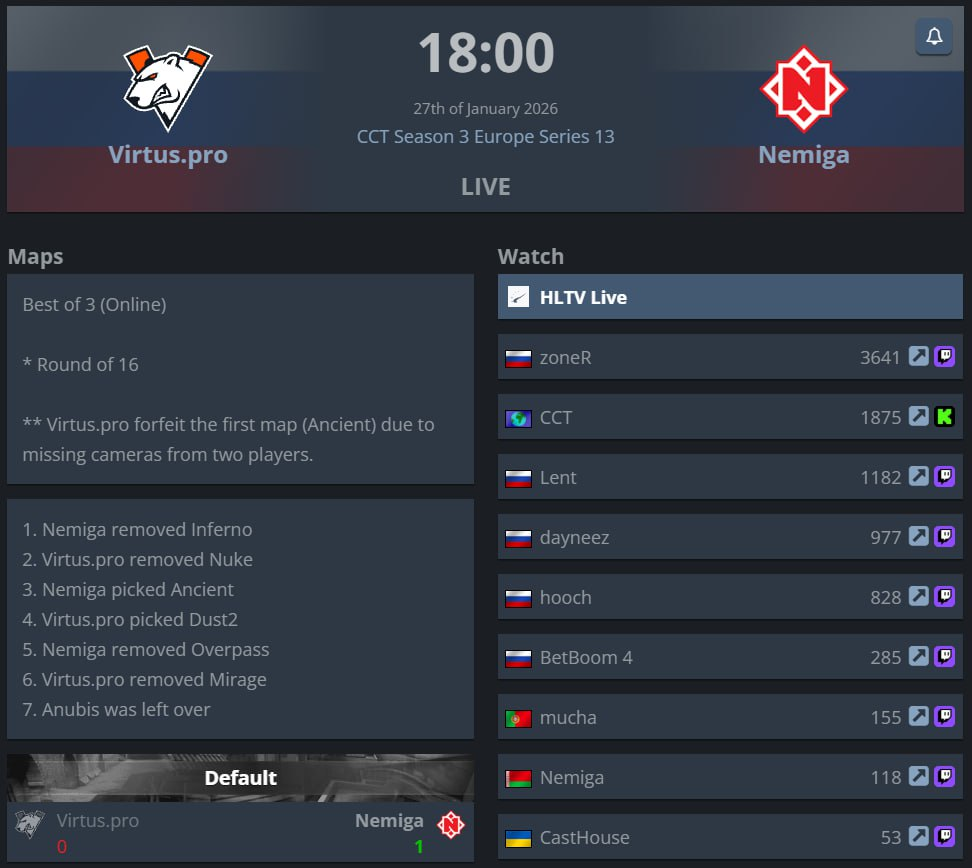 VP меньше часа назад играли матч турнира CCT Season 3 Europe против Nemiga, и с нулевой минуты летели 0-1, хотя в прематче закрывались в районе 1.40. Всё из-за технического поражения на первой мапе, которое команде выписали за отсутствие веб-камер сразу у двух игроков.