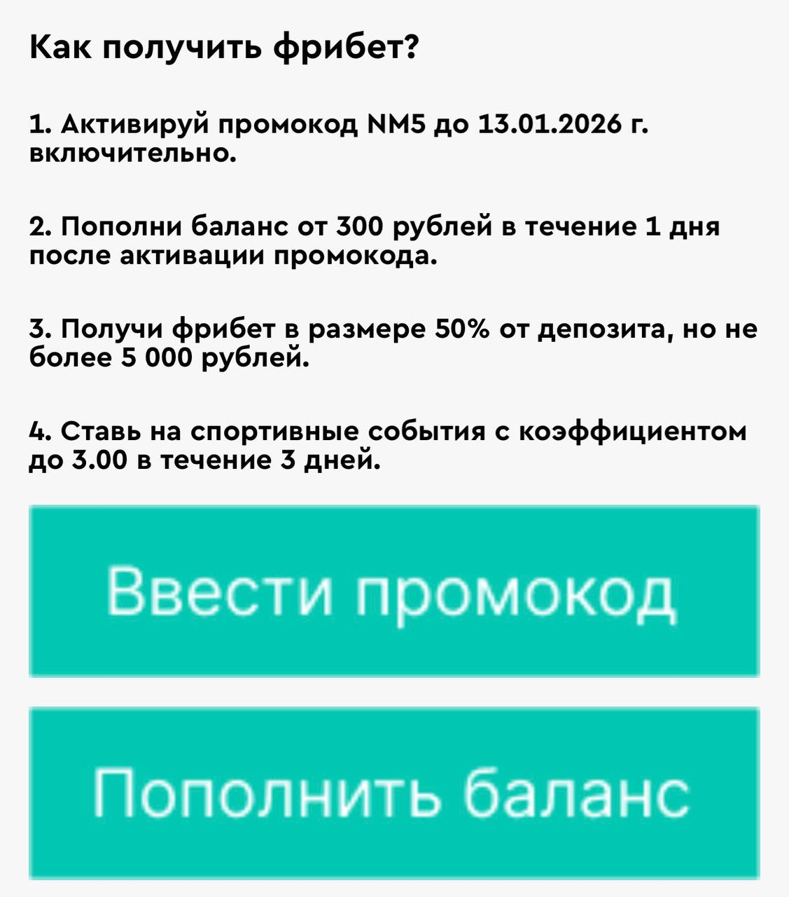 Тем более что дадут вполне неплохие 50% от депозита, и пополнить счёт надо на сумму всего от 300 рублей. В общем, советуем проверить СМС и уведомления от букмекера. Ну и успевать чётко до матча «Барсы» и «Реала» не нужно, действует акция до 13 января.