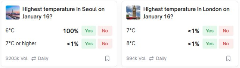 Да и сам рынок выглядит элементарно. Предлагается пиковое значение температуры в определённую дату и в конкретном городе: Сеуле, Нью-Йорке, Торонто или где-то ещё. Например, 17 января столбик термометра в Лондоне не поднимется выше 7 градусов по Цельсию. От трейдера требуется выбрать один из двух вариантов: да или нет.