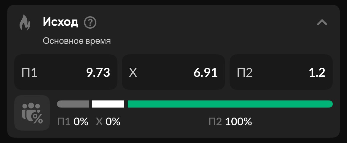 Клиент PARI выцепил самый жир, зарядив на П1 по 67.00. Жаль, что всего 1000. А вот его коллега попал на дикие эмоциональные качели: при счёте 2:1 в пользу «Альбасете» он зарядил на андердога в основное за 1.40. И не какую-то мелочь, а полмиллиона рублей. Затем «Реал» сравнял в компенсированное, но гол могли отменить — ну, надежда на это точно была. Представьте лицо игрока, когда спустя минуту «Альбасете» воткнул третий за кэф под сотку. Возможно, самые нервные 200 тысяч в его жизни.