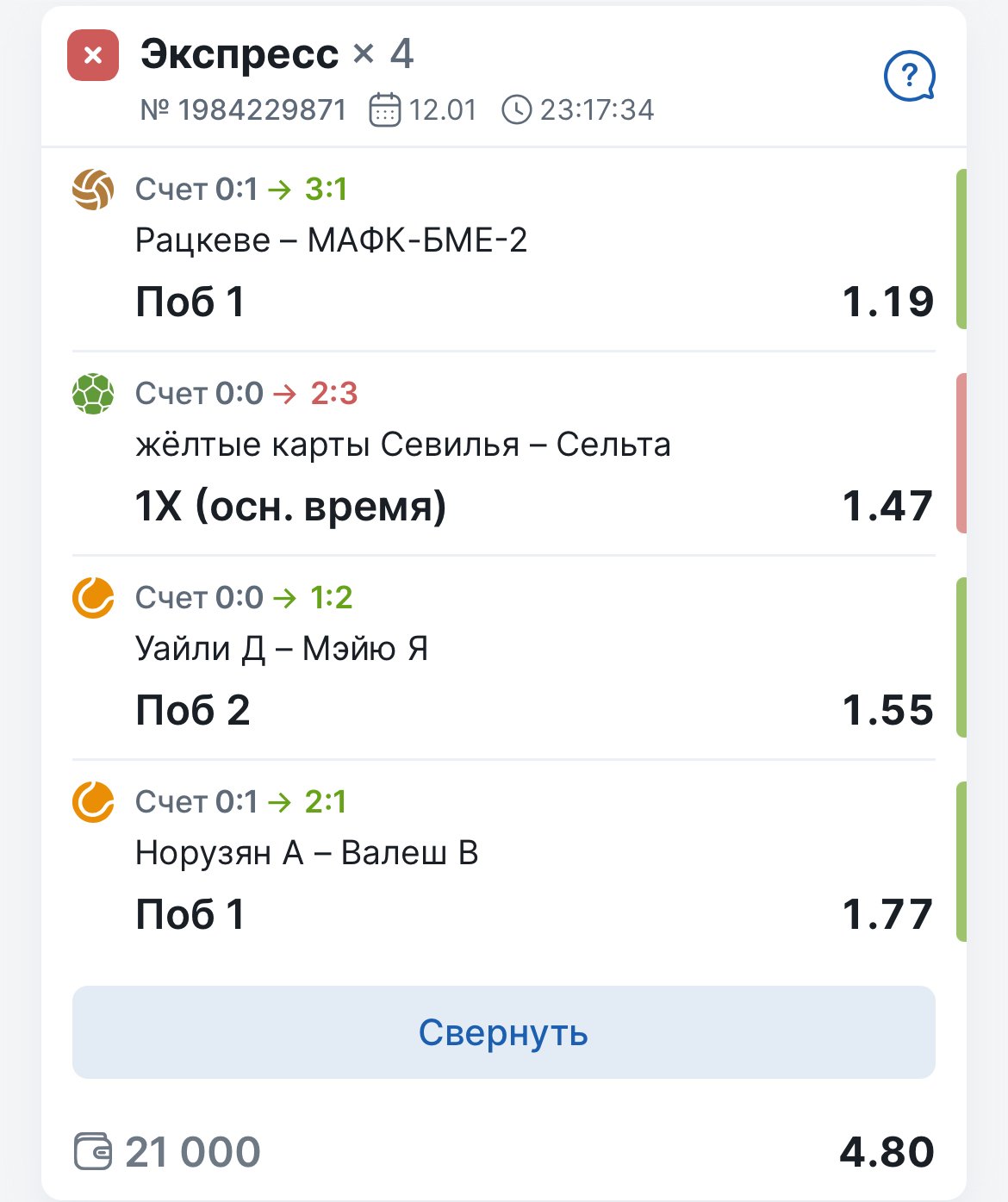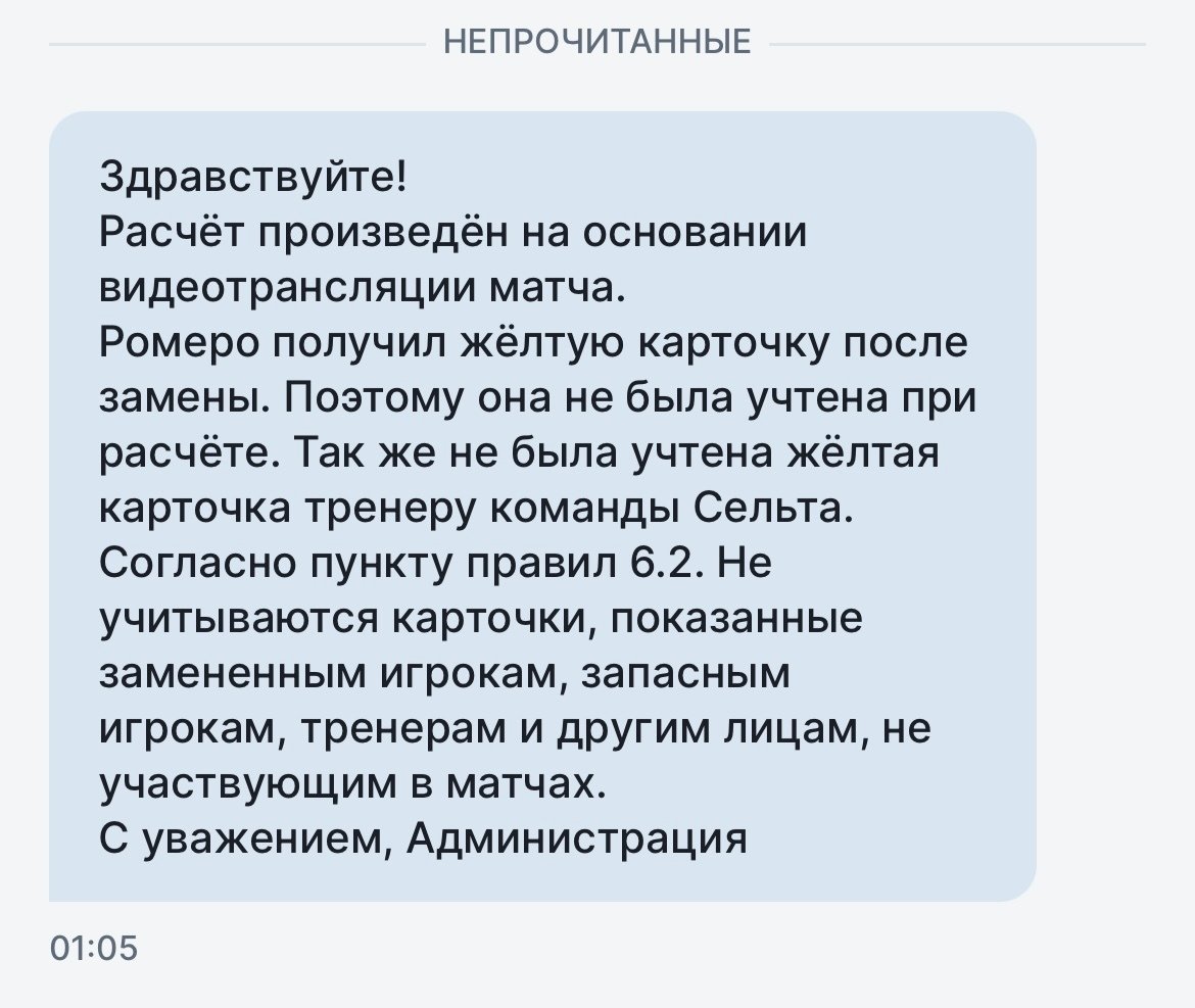 Хотя экспресс был максимально близок к заходу, последним пунктом оставалось как раз непоражение «Севильи» по ЖК. И ведь ставка была выгодная по стате, даже каппер Legalbet Сергей Черкасов подсвечивал Ф1(0) в телеграм-канале. Но увы: к 88-й минуте «Сельта» проигрывала по жёлтым 1:2, а затем забила с пенальти — и начала рубить от души. Оскар Мингеса выхватил карточку на 89-й, Уго Альварес — на 93-й, то есть буквально за минуту до финального свистка.