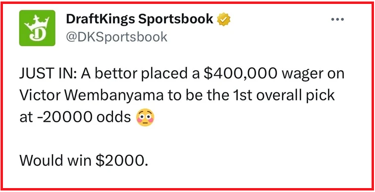 Нет, не проиграл: американский букмекер DraftKings сообщил, что один беттор запулил 400 тысяч долларов (33 миллиона рублей!) на Виктора Вембаньяму в качестве первого пика на драфте НБА. И даже коэффициент 1.005 на такой исход выглядел как вполне себе выгодная инвестиция — по сути ещё год назад все знали, что никаких других претендентов на №1 драфта нет и быть не может.