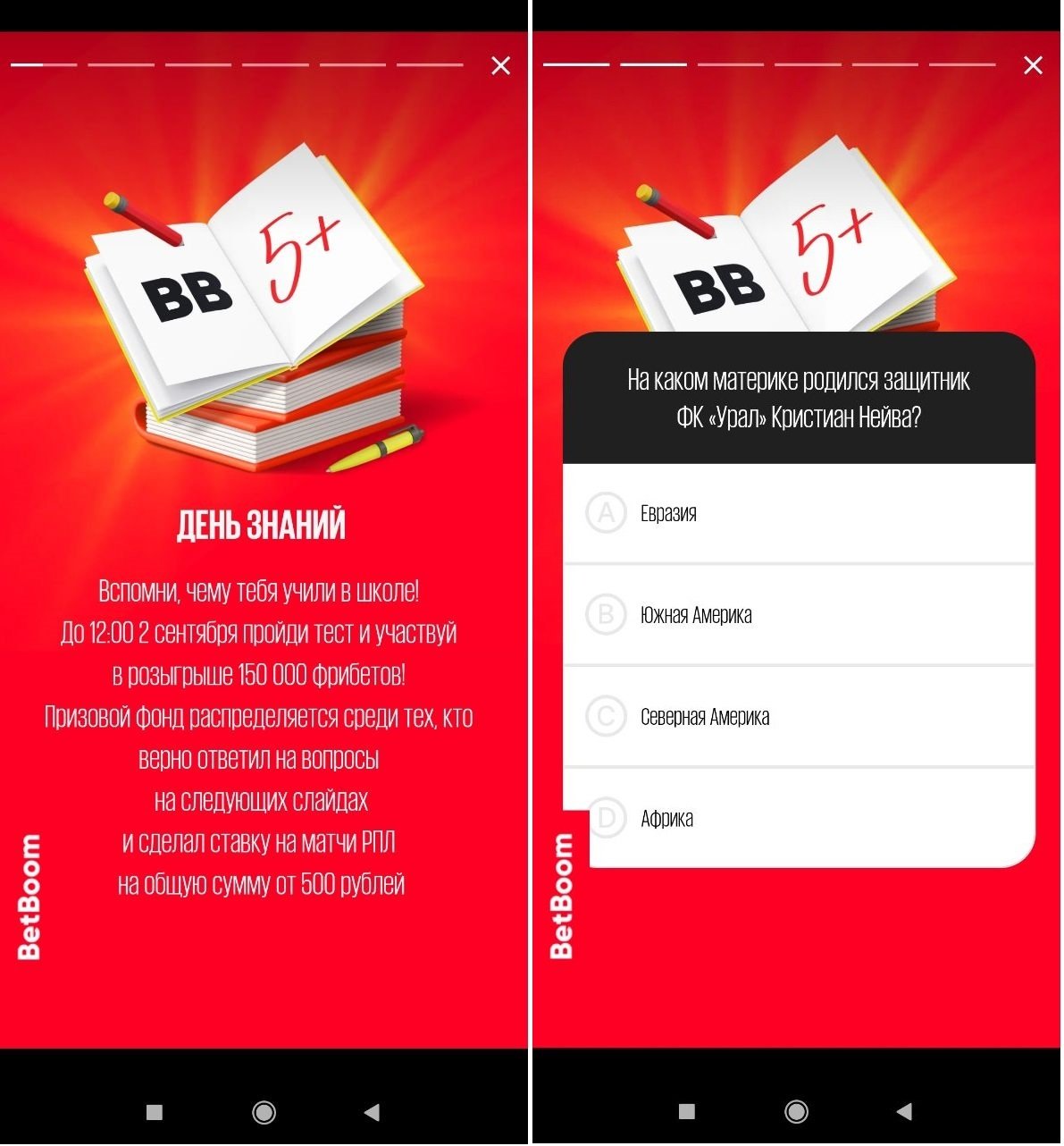 Если вдруг соскучились по школе — залетаем в приложуху BetBoom, там есть сторис «День знаний». Нужно правильно ответить на 4 вопроса, дедлайн — до завтра 12:00. Авторы 4 правильных ответов попадают под фрибетики.