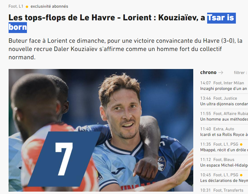 В прошлом туре против «Лорьяна» Кузяев положил второй гол за «Гавр» в Лиге 1 и снова подвинул персональный тотал на сезон. Теперь так: