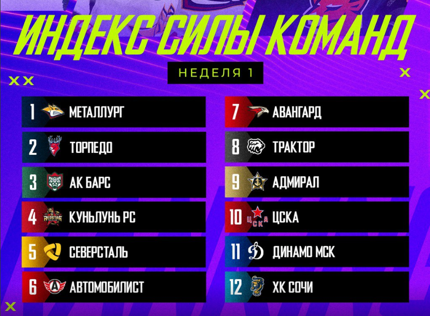 «Металлург» — топ-1, «Торпедо», «Ак Барс» и — сюрприз — «Куньлунь» в первой четвёрке. Из интересного: действующий чемпион ЦСКА лишь 10-й, а фаворита сезона СКА нет даже в топ-12.