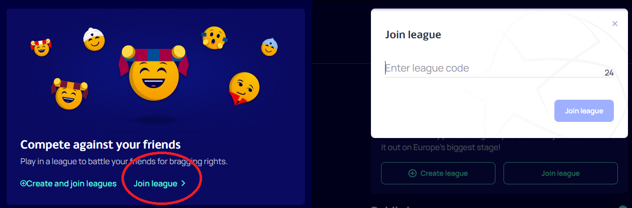 Если у вас есть состав, нужно нажать join league, а затем, во всплывающем окне ввести следующий код: 33HHGXQS08