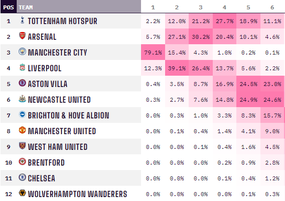2. У «Ливерпуля», идущего 4-м, больше шансов на топ-2, чем у всех остальных (за исключением «Сити») — 51%. У «Арсенала» существенно меньше — лишь 33%. При этом на попадание «Ливерпуля» в число двух лучших можно поставить аж за 2.55