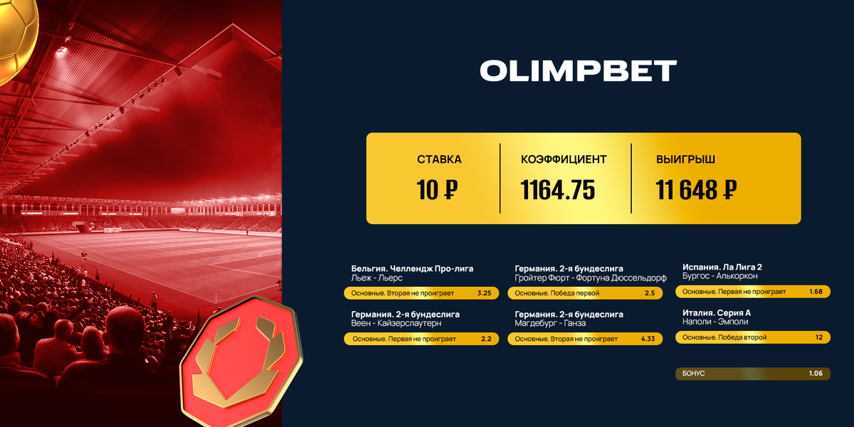 Клиент Olimpbet соорудил купон из андердогов: к непоражениям «Льерса», «Веена», «Ганзы» и «Бургоса» добавил победу «Гройтера» из Второй Бундесилиги практически по равной и сумасшедший апсет «Эмполи» против «Наполи» за 12.0.