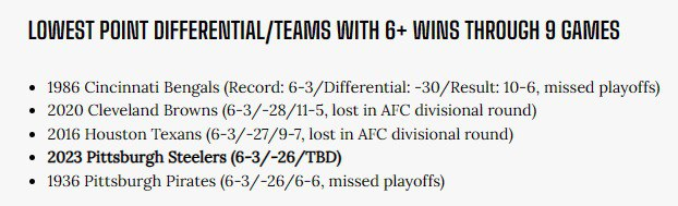 За 9 туров «Питтсбург» наиграл на «минус 26» по очкам, но всё равно победил 6 раз. Только 4 команды в лиге стартовали подобным образом — у всех было по 6 побед и разница не выше «минус 25». Сегодня «Стилерс» сыграют с «Кливленд Браунс», которые тоже попадали в этот список — в 2020-м.