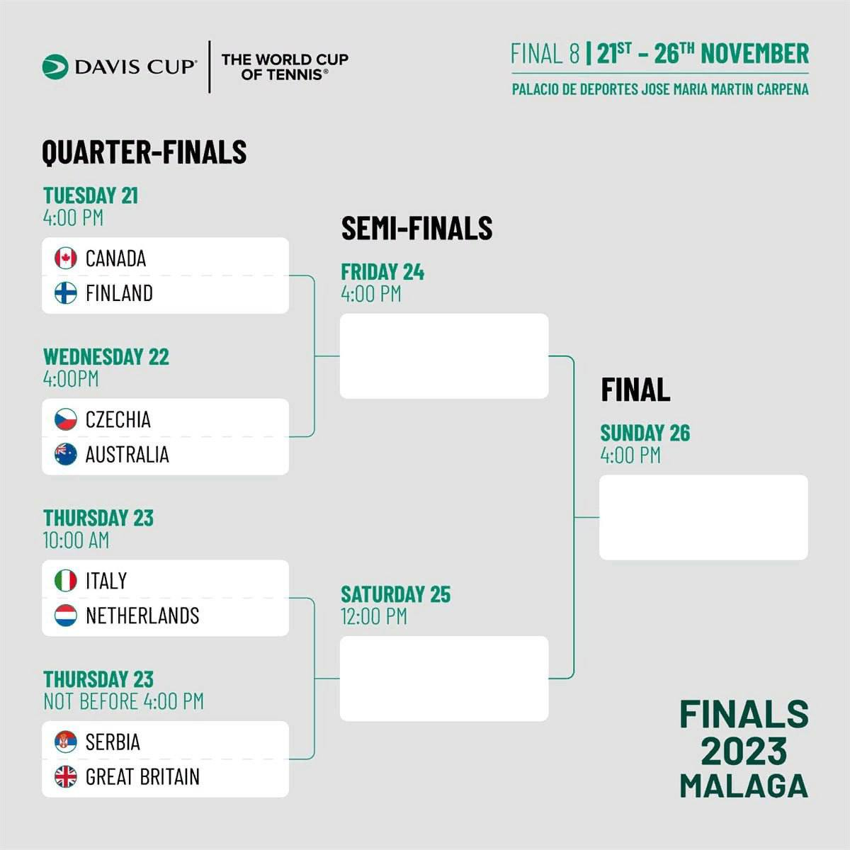 Финальная часть стартует уже сегодня: в 1/4 финала Канада зарубится с Финляндией, Чехия — с Австралией, Италия — с Нидерландами, Сербия — с Великобританией. После выигранного финала Итогового Джокович никак не откомментировал предстоящий командный турнир, но уже прилетел в Малагу.