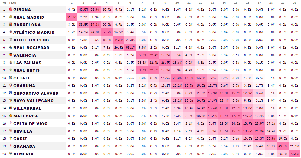В обновлённой версии симуляции Ла Лиги от суперкомпьютера Opta «Реал» главным и единственным фаворитом на титул остаётся «Реал»: он отстаёт на 1 очко от «Жироны», имеет матч в запасе и по мнению машины заберёт трофей с вероятностью 91,2%. Букмекеры предлагают на «Реал» даже слегка валуйные 1.25