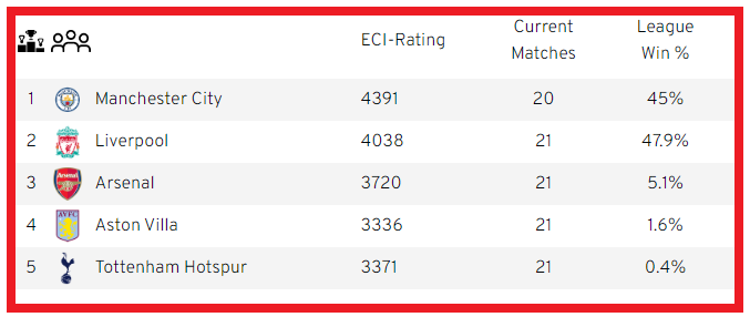 Предикт-модель, основанная исключительно на статистике, обновилась к 22 туру, который стартует сегодня. Согласно обновлению, на титул претендует только 5 клубов (у остальных вероятность чемпионства 0%), «Ливерпуль» — первый фаворит с 47,9%, «Сити» близко — 45%.