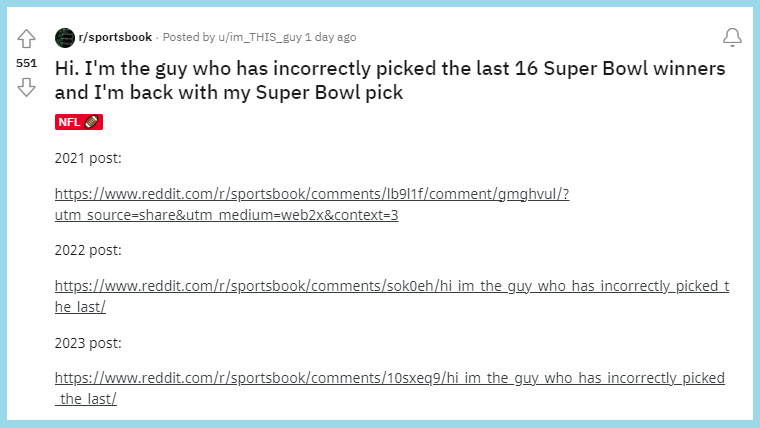 Пользователь под ником u/im_THIS_guy никак не может справиться с подбрасыванием монетки — всё время выпадает одна и та же сторона (неверная). Чел не просто выбирает одну команду из двух перед финальным матчем, а пишет целый аналитический пост с какими-то цифрами, процентами и фамилиями. Пока итог один — 16 лет подряд выигрывает другая команда.