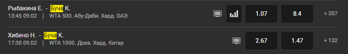 Первый: в случае быстрого поражения от Рыбакиной в Абу-Даби Буча планирует оперативно перелететь в Доху и сыграть матч с Нао Хибино. И такой расклад вполне реален: победа Рыбакиной над Бучей идёт всего за 1.07