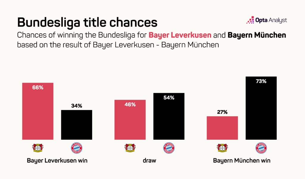 Суперкомпьютер Opta наглядно показал, как изменятся шансы «Байера» и «Баварии» на победу в Бундеслиге в зависимости от исхода их завтрашней очной встречи. Напомним, сейчас «Байер» опережает «Баварию» на 2 очка, а Opta оценивает шансы на титул как 54% к 46% в пользу мюнхенцев.