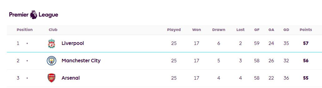 Первый раз подобное было в сезоне-1998/99 — после 25 туров таблицу возглавлял «Манчестер Юнайтед» (вторым был «Челси», третьим «Арсенал»). Чемпионом стал «МЮ».