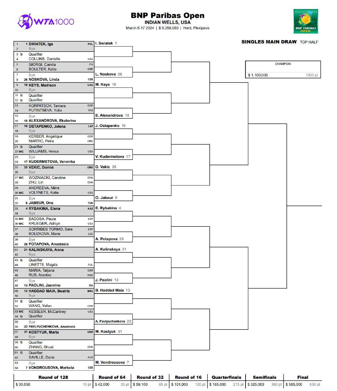 В этом году Рыбакина попала в довольно сложную половину сетки, где помимо неё сыграют ещё 7 теннисисток топ-15. Но самое главное, с огромной вероятностью в полуфинале её будет ждать первая ракетка мира Ига Швёнтек, которая в конце 2023 года и начале 2024-го Швёнтек забрала два «тысячника» подряд и только в феврале прервала 13-матчевую победную серию на турнирах серии «Премьер».