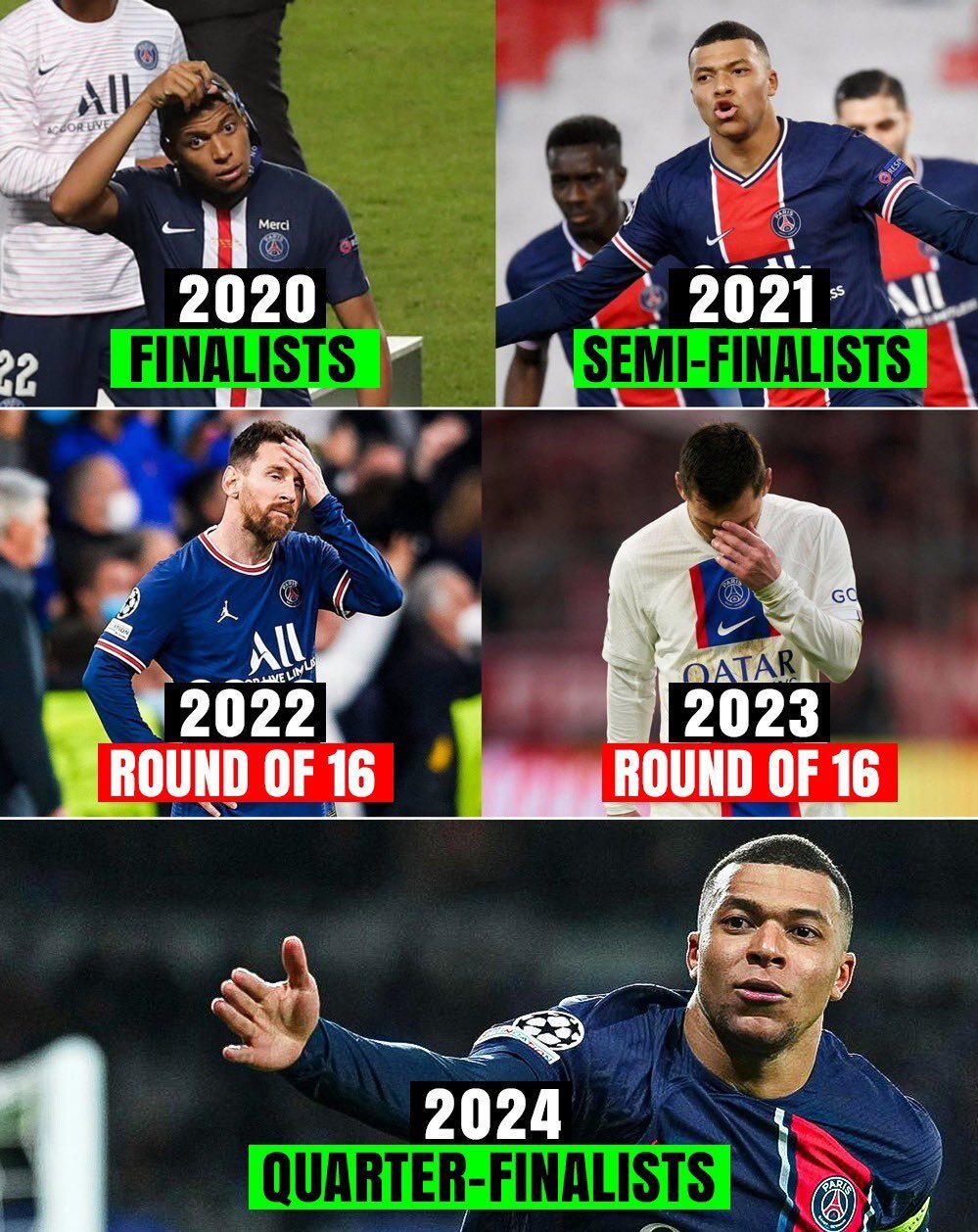 Сезон-2019/20 без Месси — «ПСЖ» дошёл до финала, где уступил «Баварии». Сезон-2020/21 без Месси — «ПСЖ» дошёл до полуфинала, где уступил «Сити».