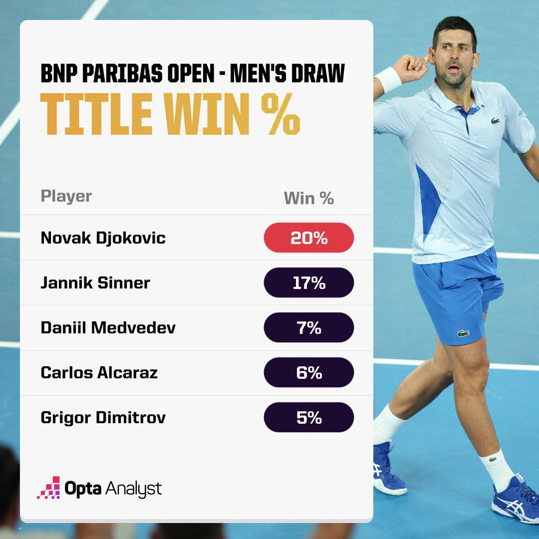 Из-за пандемии и проблем с визой Новак не принимал участие в этом турнире с 2019 года, а последний титул вообще взял в 2016-м — тогда грохнул в финале Милоша Раонича. Правда, вероятность титула серба всего на 3% выше, чем победа чемпиона Australian Open Янника Синнера. А вот разрыв в коэффициентах гораздо серьёзнее: