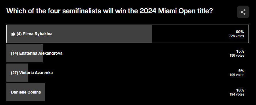 60% голосовавших на официальном сайте WTA считают, что у Елены Рыбакиной большие шансы выиграть турнир в Майами. С начала 2023 года это уже 7-й полуфинал Рыбакиной на уровне WTA-1000, чаще до стадии 1/2 финала этого уровня за 2 сезона доходила только Ига Швентек (9).