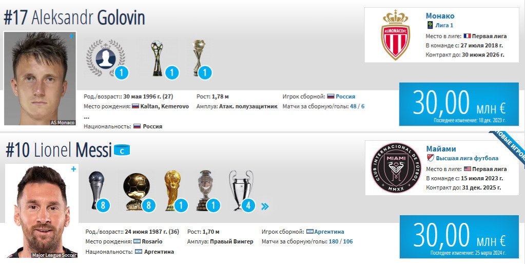 В последнем обновлении веб-сайт снизил трансферную стоимость Месси с 35 до 30 миллионов евро, а ровно столько стоит Александр Головин из «Монако». Россиянин в вышке Франции в этом сезоне за 24 матча забил 6 голов и отдал 6 передач, а аргентинец за «Интер Майами» в недавно стартовавшей МЛС за 3 матча успел забить 3 гола и отдать голевую.