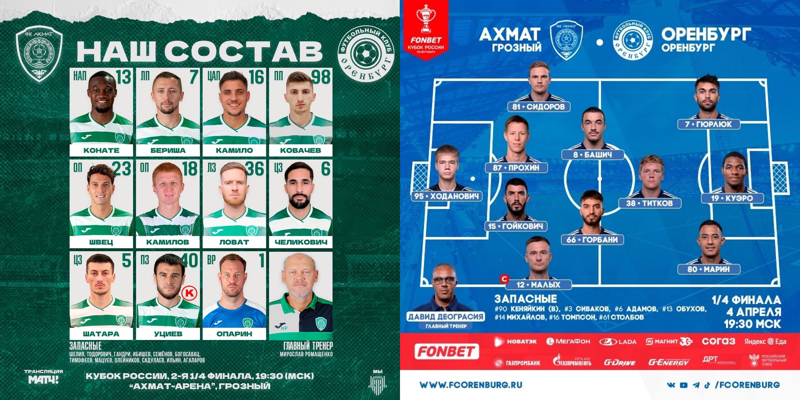 Если состав «Ахмата» мало чем отличается от привычного для РПЛ, в старте даже лучший бомбардир Мохамед Конате, то «Оренбург» в 1/8 финала выглядит слишком легко. Гости не заявили никого из своих аргентинцев — Переса (5 голов в РПЛ), Мансилья (2 гола и 3 передачи), Веры (гол и 3 передачи) и Флорентина (гол). Самым результативным игроком оренбуржцев на поле будет Джимми Марин, у которого гол и голевая передача в 19 матчах сезона в РПЛ.