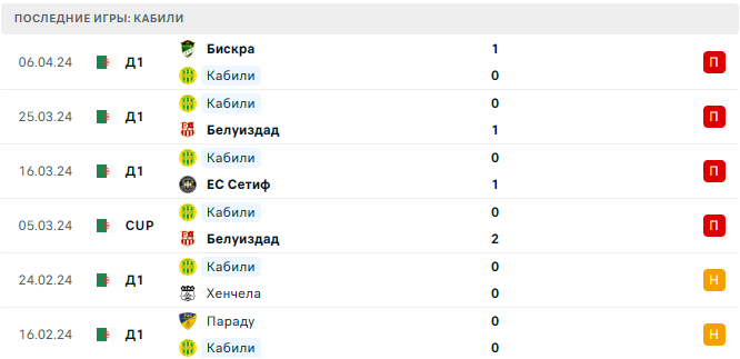 Последний раз «Кабили» забивал 2 месяца назад в ворота «Магры» (1:0) в начале 2-го тайма. После — 5 матчей без голов в чемпионате и сухой вылет из Кубка Алжира от «Белуиздада» (0:2).