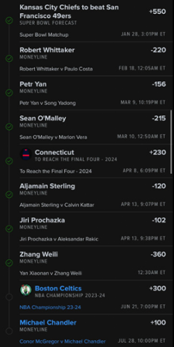 8 из 10 событий экспресса уже сыграли, включая наивысший коэффициент 6.50 в Супербоуле. Осталось — победа «Бостон Селтикс» в сезоне НБА и победа Майкла Чендлера над Конором Макгрегором в UFC. Сейчас этот двойник выглядит вероятнее, чем уже выигранная ставка на бейсбол из купона.