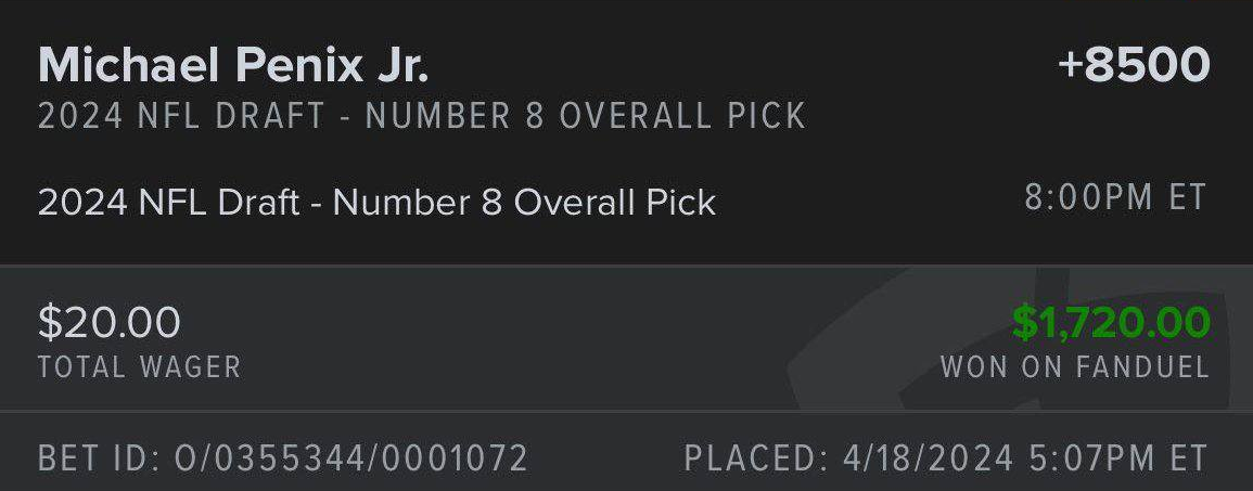 Но были и те, кто пошёл по совершенно другому пути. Например, как этот клиент, поставивший 20 долларов на то, что Майкла Пеникса-младшего выберут под 8-м номером. +1700 чистой прибыли — done.