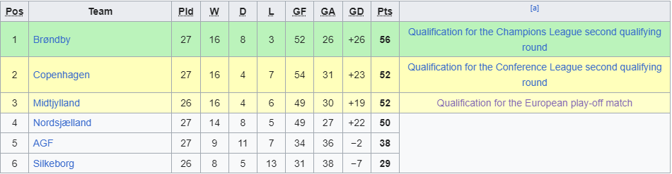 Датская Суперлига устроена таким образом, что после 22 туров 12 команд делятся на две шестёрки: первая разыгрывает две путёвки в еврокубки и одну — в плей-офф за попадание в еврокубки, а вторая разбирается, кто вылетит, а кто с 7-го места заработает ещё одно место в том самом плей-офф. И за 6 туров до конца сезона в первой шестёрке сложилась следующая ситуация: идущий на 6-м месте «Силькеборг» потерял вообще любые, даже математические шансы попасть в топ-3 — он отстаёт от 3-го «Мидтъюлланна» уже на 23 очка.