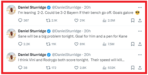 И не только: сначала бывший футболист «Ливерпуля» и «Челси» написал авторов голов (угадал 3 из 4) — Винисиус, Сане и Кейн, причём последний должен был забить с пенальти (забил!).