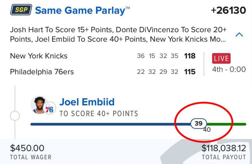 Кто-то зарядил 450 баксов на экспресс из нескольких событий на матч «Филадельфии» и «Нью-Йорк Никс» в плей-офф НБА с коэффициентом 262.30. Доехало всё, кроме одного: Харт настрелял 16 очков, Дивинченцо — 23, хозяева победили и вышли в следующий раунд, а вот Эмбиид всё заруинил — набрал 39 вместо нужных 40.
