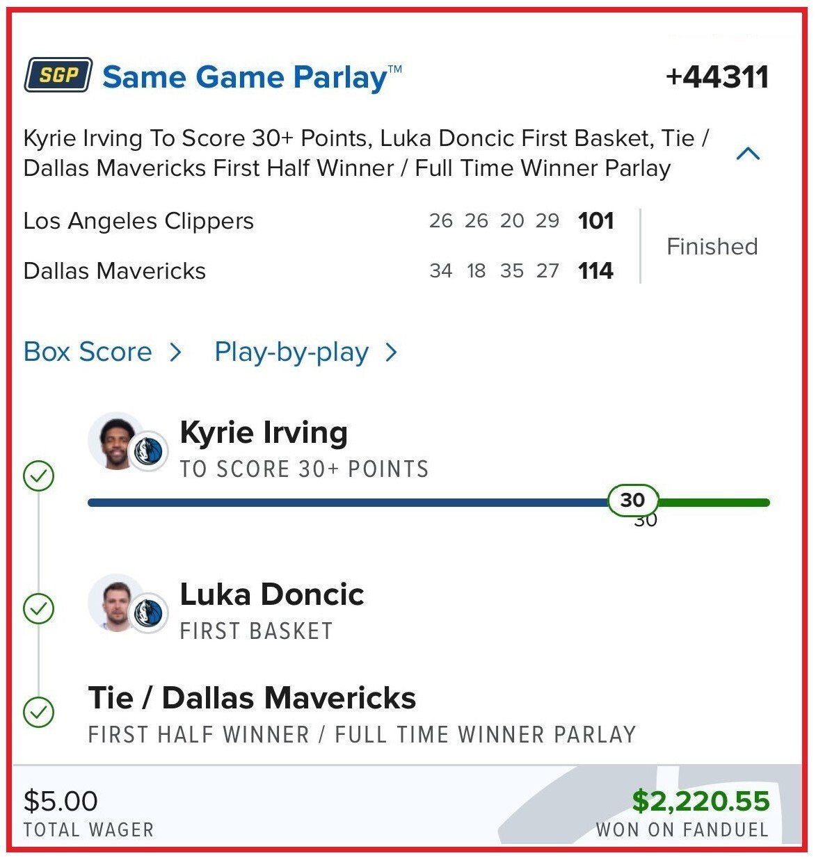 Самое интересное произошло с самым вероятным событием экспресса — 30 очками Ирвинга. Дело в том, что после 1-й половины у него было... 2 очка. А во 2-й он добил до ровной тридцатки. И 5 баксов превратились в $2220.