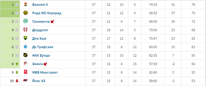 А теперь самое интересное: за тур до конца «Виллем II» обеспечил себе топ-2, а вот за второе место «Рода» и «Гронинген» в 38-м туре сыграют между собой, причём «Гронинген» будет играть дома. Разрыв между ними — 3 очка, и «Гронинген» устроит победа с любым счётом, так как у него лучшая разница голов. «Роде» же достаточно просто не проиграть.
