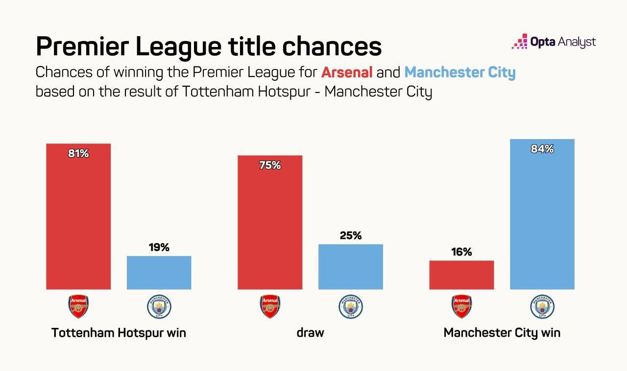 А вот если бы «Тоттенхэм» не проиграл, «Арсенал» забрал бы титул с вероятностью 75%. Напомним, ни одна команда не брала АПЛ 4 года подряд.
