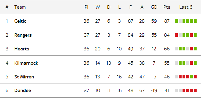 До конца чемпионата «Селтику» осталось провести ещё 2 матча, а вот у «Рейнджерс» впереди всего один тур — а разница между ними составляет 3 очка. «Рейнджерс» могут стать чемпионами только при одном-единственном раскладе — если выиграют в последнем туре, а «Селтик» проиграет оба своих матча с «Килмарноком» и «Сент-Мирреном».