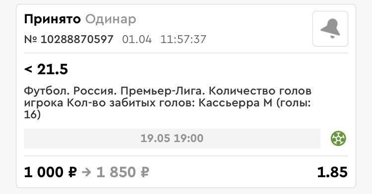 1 апреля клиент PARI решил сделать ставку на тотал голов Матео Кассьерры в чемпионате России — меньше 21,5 за 1.85