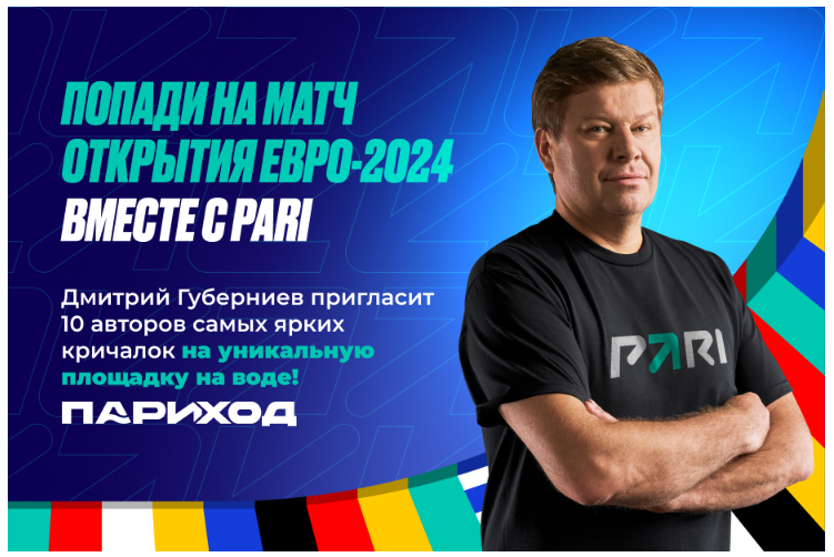 Акция проводится с 7 по 10 июня, победители станут известны 11 июня. Авторов 10 самых бодрых и запоминающихся кричалок выберет Дмитрий Губерниев. Каждый из победителей получит по два пригласительных билета на «Париход» на матч открытия Евро-2024.