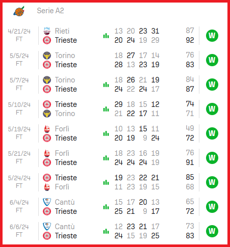 Последний раз выиграть стартовую 10-минутку и матч не удалось против «Урании» — ничья в 1-й четверти (22:22) и поражение в матче (84:86). Следующие игры и начальные 10-минутки «Триесте» выиграл. 8 из 9 таких матчей пришлись на плей-офф, включая серию против «Форли» (3-0) — победителя регулярки в группе.