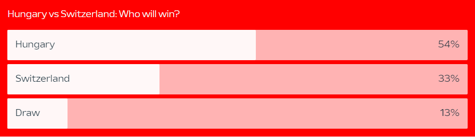 В голосовалке на сайте УЕФА больше половины голосов за исход матча Венгрия — Швейцария — 54% — в пользу венгров, и только треть опрошенных выбрали победу швейцарцев. И это интересно — ведь букмекеры в этом матче считают Венгрию довольно очевидным аутсайдером: