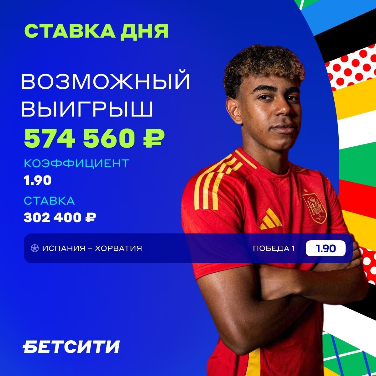 Telegram-канал БЕТСИТИ поделился ставкой дня. В 1-м туре Евро-2024 игрок поставил на победу Испании над Хорватией 302400 рублей за коэффициент 1.90. Возможная выплата — 574560 рублей!