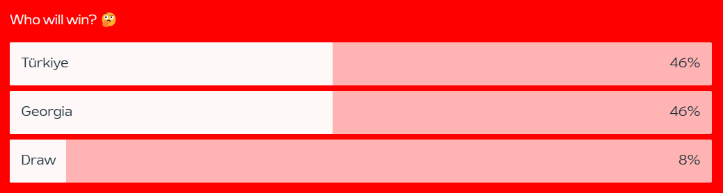 Посетители сайта УЕФА не видят фаворита — по 46% в обе стороны и только 8% на ничью. Для Грузии это 1-й крупный турнир в истории. Но и для сборной Турции последним и главным успехом на Евро стал 2008 год — полуфинал. После турки не попали на Евро-2012, а в 2016-м и в 2021-м вылетели на групповых этапах.